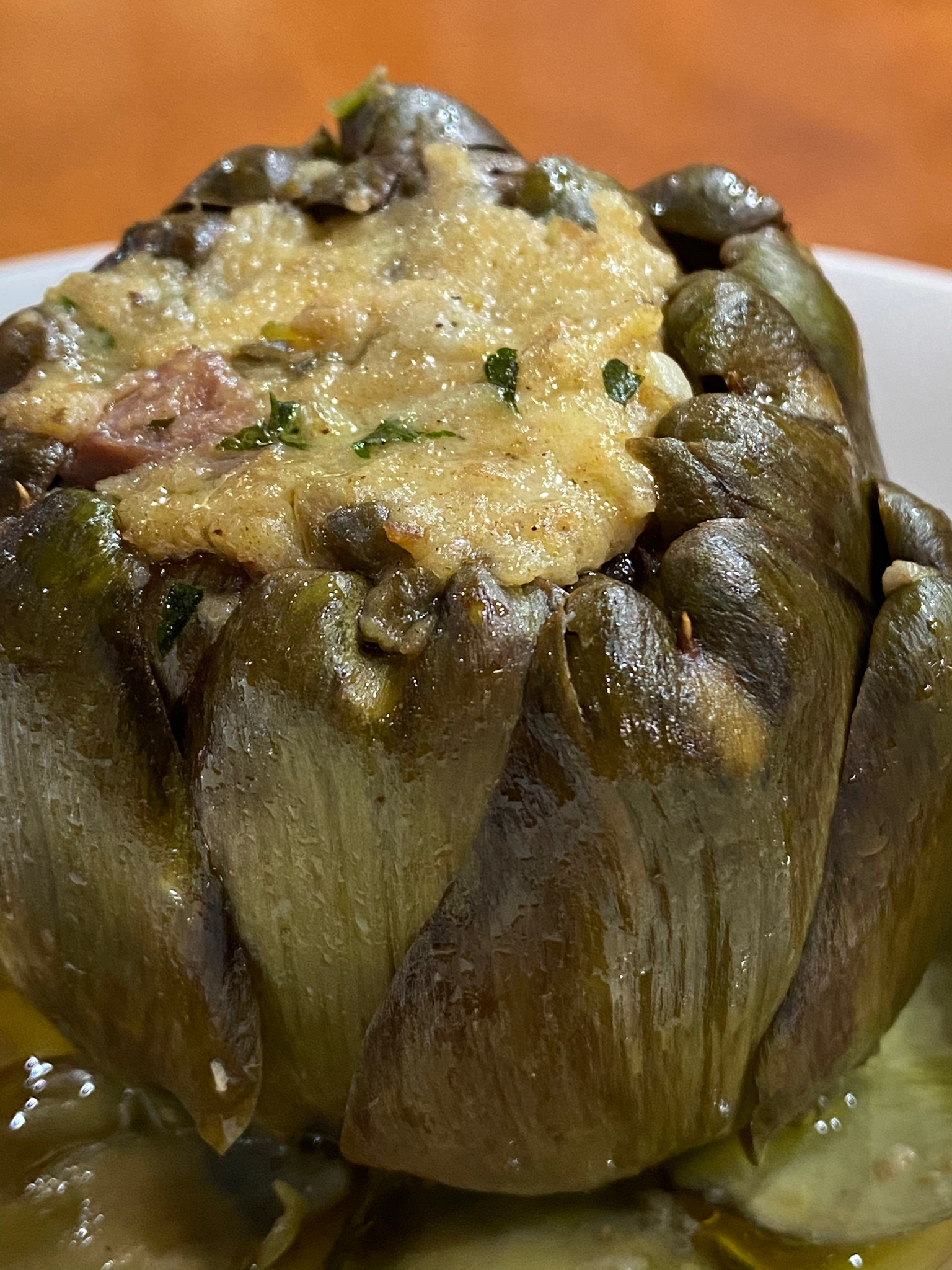 Di certo nel mio blog non potevano mancare i carciofi alla napoletana. Per la ricetta ho usato le mammole, tonde e belle strette ,il nome più usato da noi campani sono “mammarelle ‘mbuttunat” in italiano mammole imbottite. Le mammole oppure cimarolo come viene chiamato nel Lazio è un carciofo prevalentemente romanesco ed è ottimo, gratinato, arrostito, con la pasta,fritti etc. È l ‘ortaggio che fa da padrone in inverno e in più oltre che ad essere versatile contiene tanti benefici per il nostro corpo ,è antiossidante e fa bene al fegato . Per la ricetta napoletana: