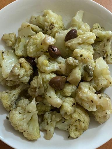 Copri il tegame con un coperchio,porta sul fuoco e lascia cuocere,mi raccomando a non girarli di continuo altrimenti si spappolano se mai scuoti il tegame. Per vedere se è cotto fai la prova forchetta,se entra facilmente nel ciuffo del cavolfiore è pronto. Prima di spegnere aggiusta di sale,i capperi erano salati e quindi rilasciano sale. Il piatto è pronto.