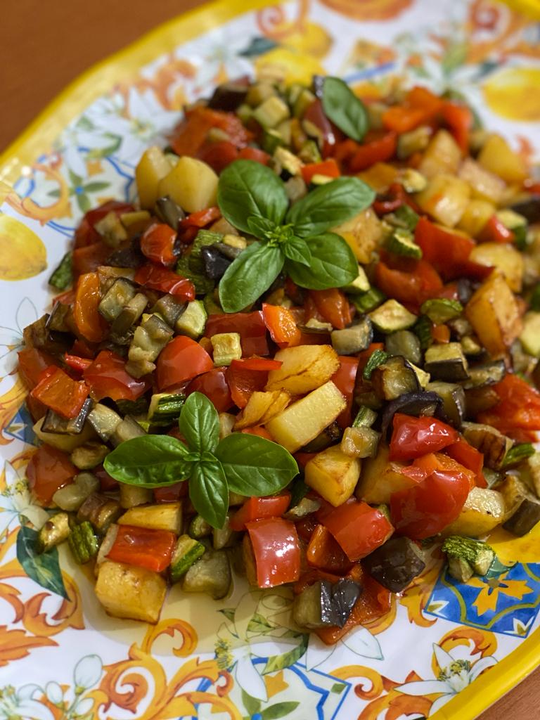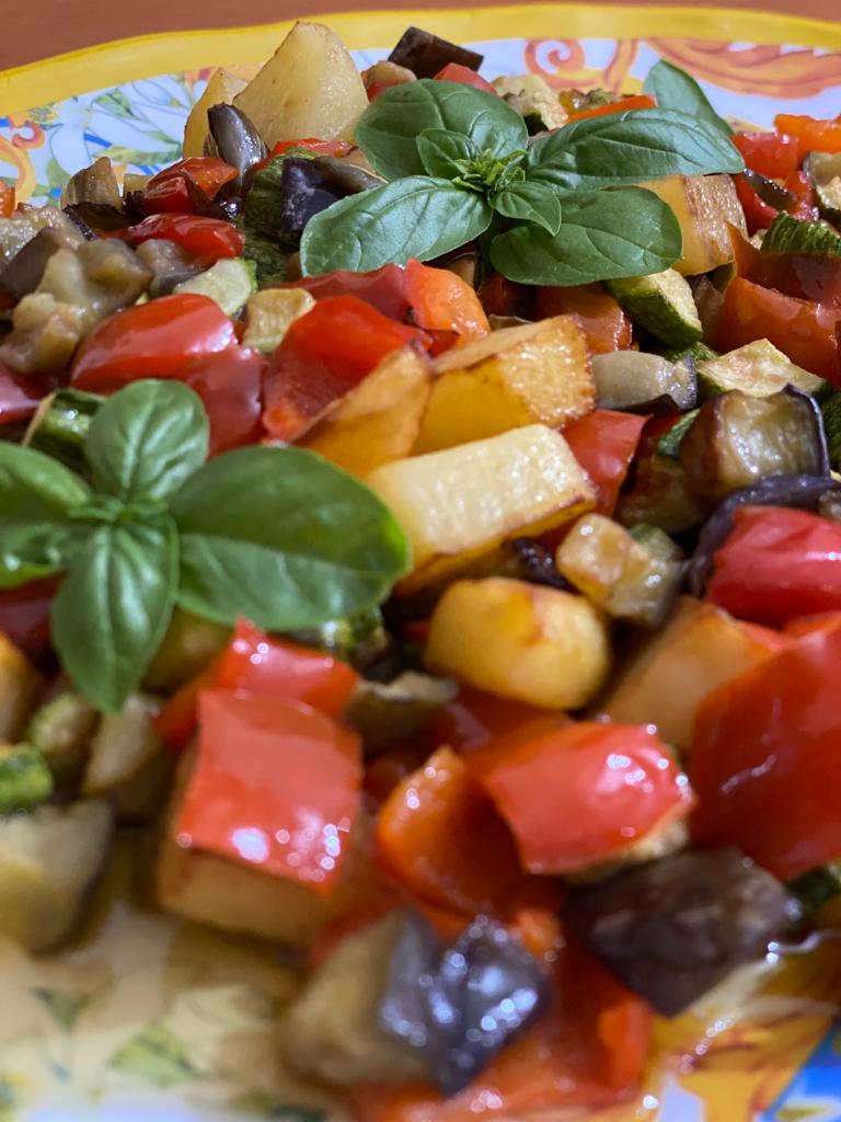 dadini, disponi dopo averli tagliati in ciotole differenti perché la cottura è differente. Preleva con la schiumarola le melanzane e versa i peperoni, copri con un coperchio per farli appassire, poi togli il coperchio e lascia rosolare. Una volta pronti passa con le patate, fai cuocere bene a doratura. Infine versa tutte le verdure nella padella aggiusta di sale,amalgama e servi con basilico fresco.