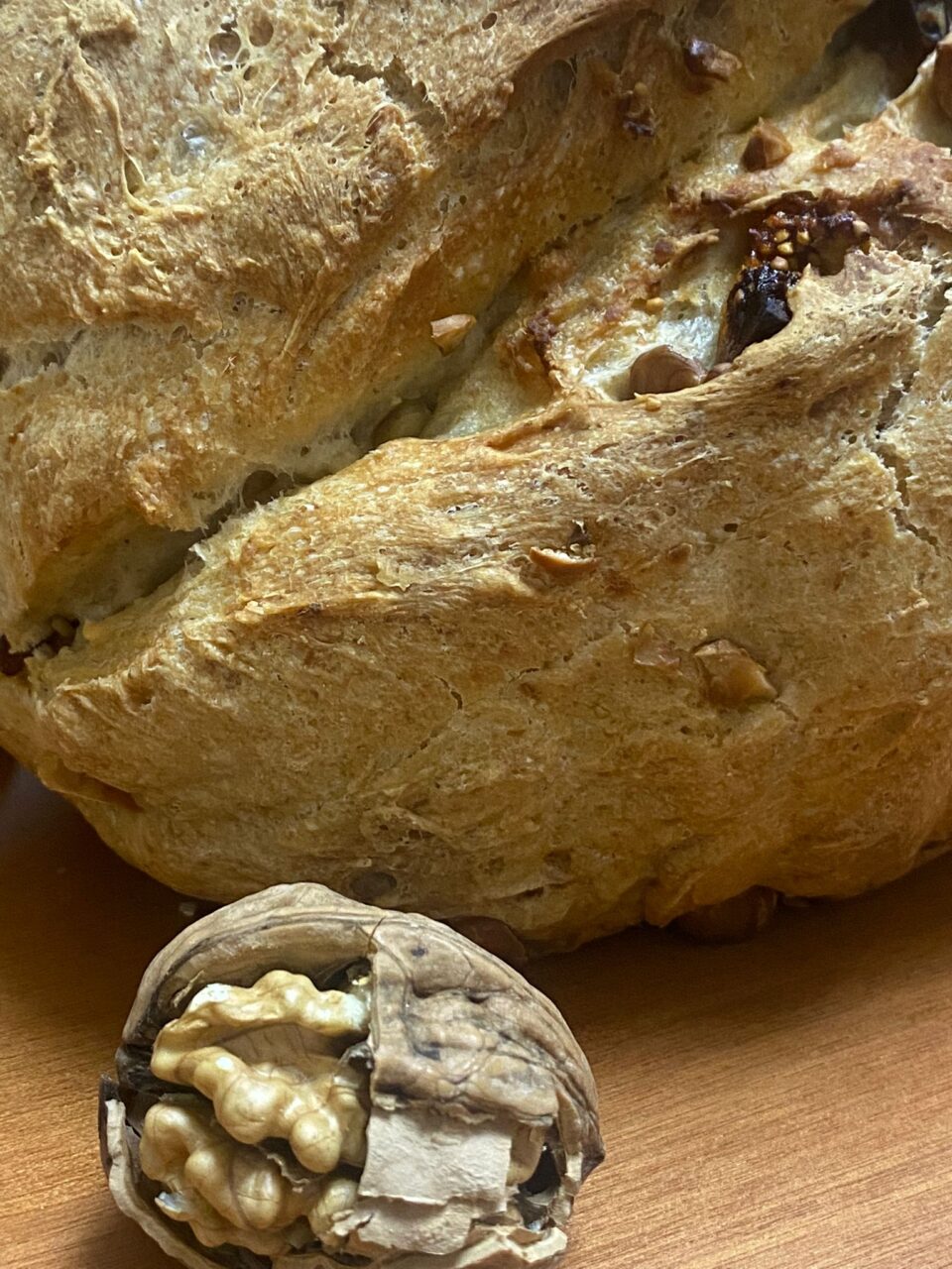 Spostati a questo punto sulla spianatoia, impasta energicamente forma un bel panetto. (L’ impasto deve essere bello sodo no molle) Riponi nel cestino per la lievitazione, copri con la pellicola trasparente oppure con una cuffietta, metti in forno a lievitare, tenendo la lucina accesa. Intanto metti in ammollo l’ uvetta, taglia a pezzetti i fichi secchi e le noci tritale grossolanamente, metti tutto da parte.