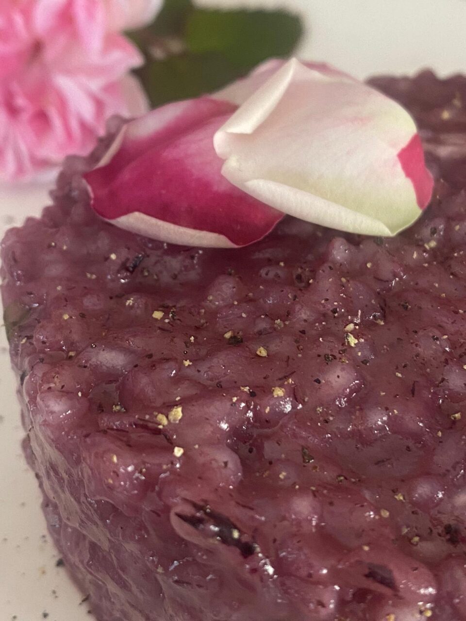 altrimenti si copre il sapore di rose. Ora non ti resta che impiattare, posiziona un coppapasta nel piatto,versa al suo interno il riso,poi toglilo delicatamente, spolverizza con il pepe nero e decora con i petali di rosa 🌹 Fai la stessa cosa con l’ altro piatto e servi.