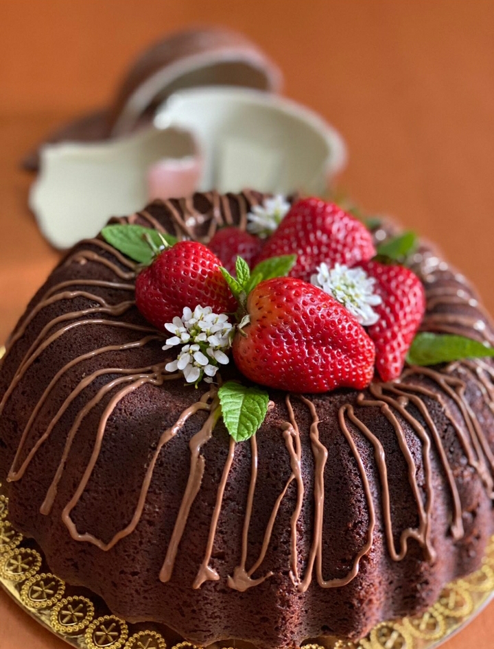 Quando il dolce sarà cotto aspetta che si raffreddi completamente, quindi posiziona su un piatto da portata, sciogli il restante cioccolato in microonde, versalo poi in una sac a poche e decora la torta, posizionando al centro delle fragole. Una volta finito puoi gustare la tua torta con uova di Pasqua.
