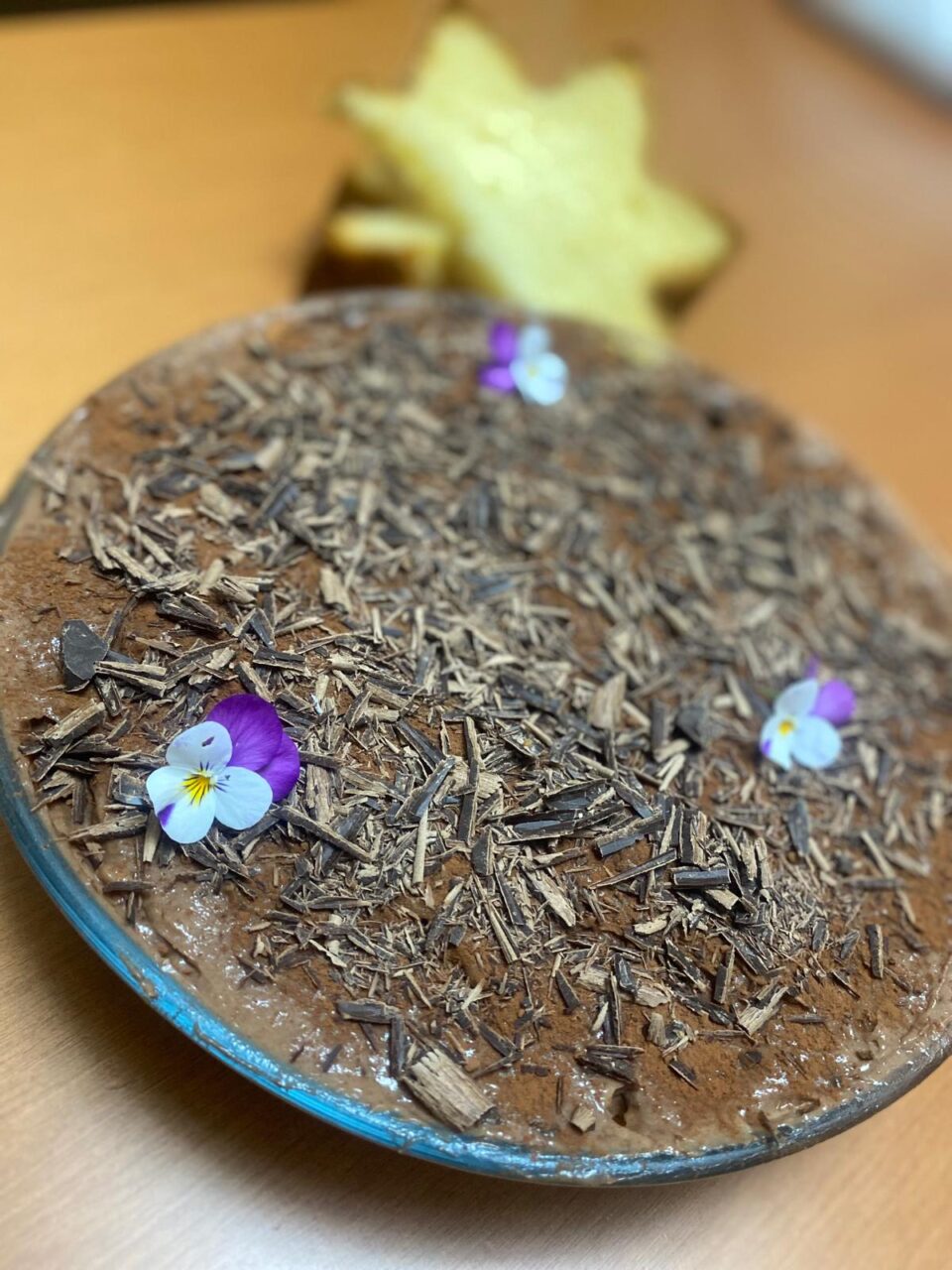 cacao amaro e decora con cioccolato fondente grattugiato.