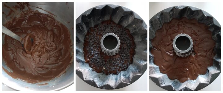 Versate metà dell’impasto in uno stampo a ciambella (da bundt cake) da 24 cm di diametro alto circa 10 cm ben imburrato ed infarinato. Sopra l’impasto distribuite le gocce di cioccolato fondente e coprite con l’altra metà dell’impasto.