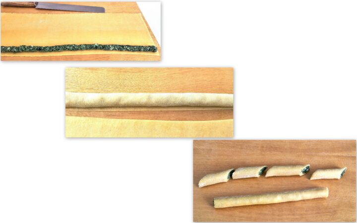 - Ora spennelliamo una sfoglia alla volta con l’ uovo sbattuto e disponiamo il ripieno grosso come il dito mignolo attraverso la sacca da pasticceria e arrotoliamo inglobandolo accavallando la sfoglia di circa un centimetro.