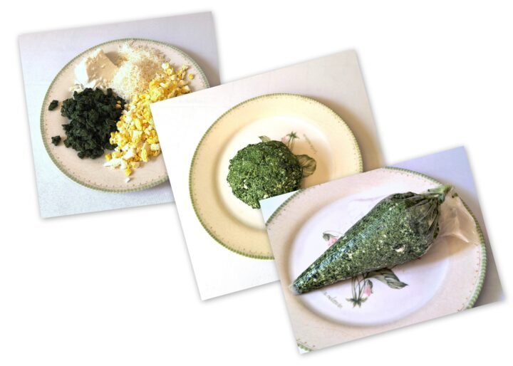 - Versiamo tutto in una ciotola, saliamo e pepiamo e amalgamiamo ottenendo un impasto ben amalgamato. (naturalmente potete usare i vostri ripieni preferiti invece del mio che ho preferito essendo vegetariana e usando le uova sode come parte proteica e la ricotta, voi potete usare prosciutto cotto o mortadella o carne macinata a vostro gusto, l’importante in questo caso è unire un uovo o una patata lessa per amalgamare gli ingredienti affinchè in cottura non si sbriciolino ed escano dalla sfoglia)