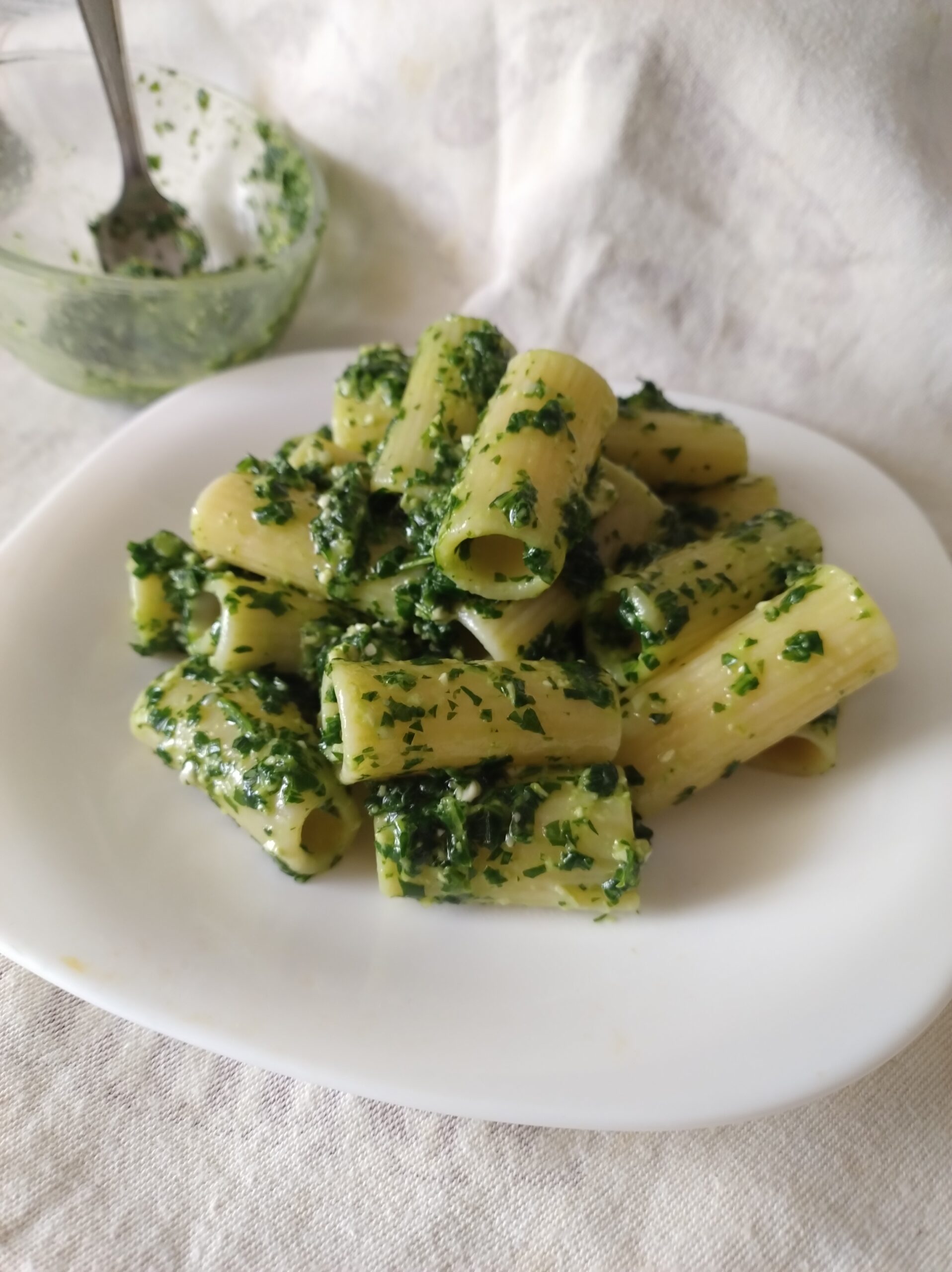Pasta con pesto di rucola e pinoli. Un primo piatto vegetariano, molto facile e veloce da realizzare. Per il pranzo di tutta la famiglia.