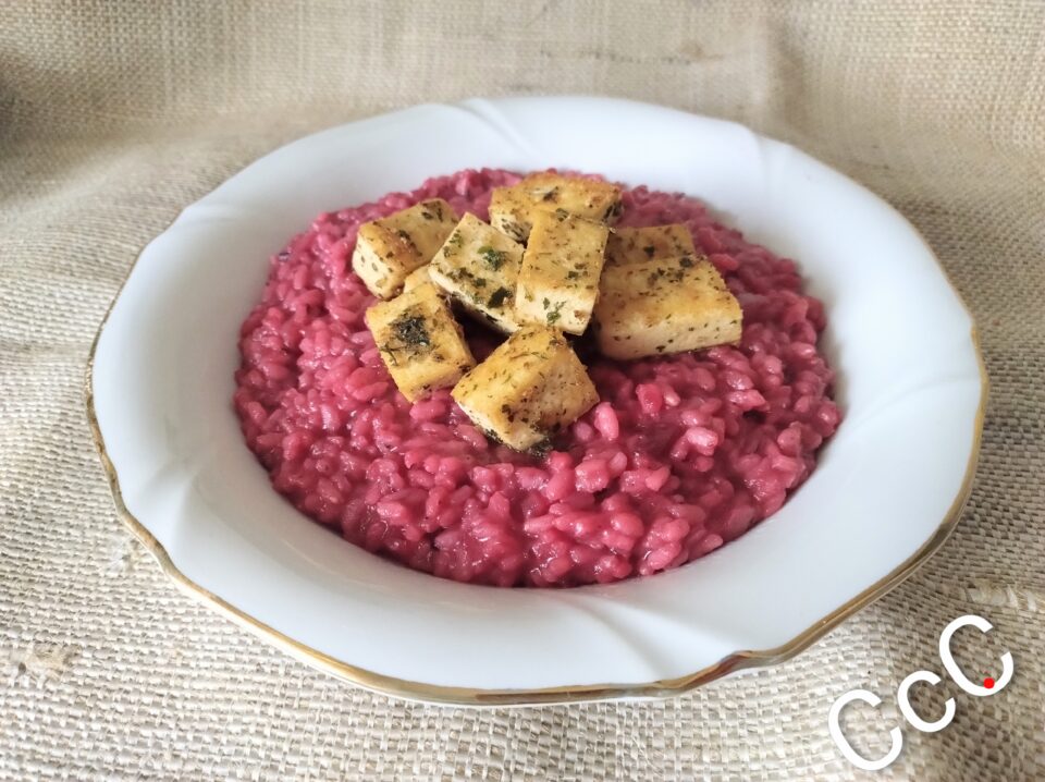 Risotto alla barbabietola con cubetti di tofu. Un piatto vegetariano, completo, nutriente e sfizioso. Molto…