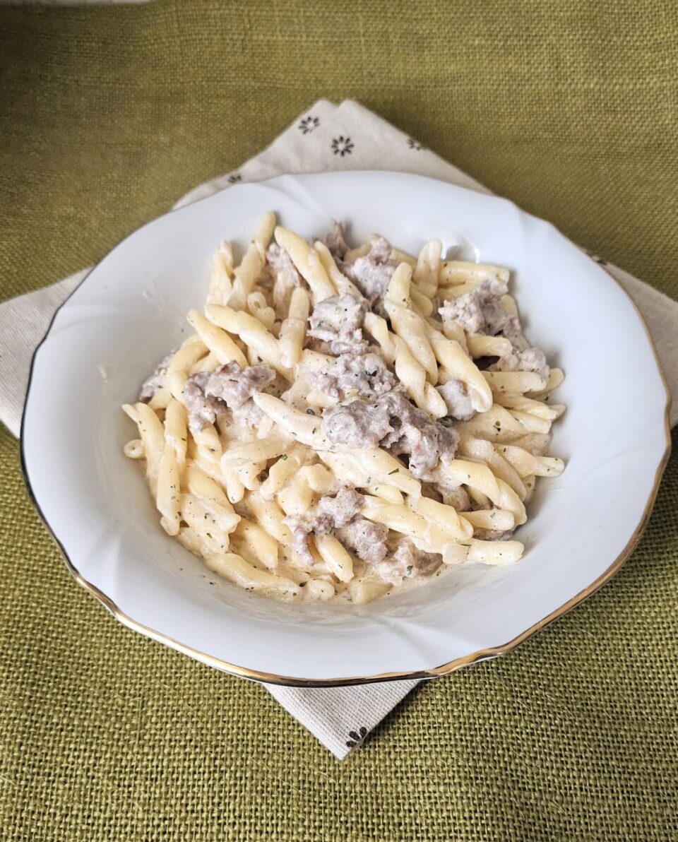 La ricetta classica prevede la panna fresca, della salsiccia umbra, e un po’ di tartufo oppure olio di tartufo; anche se in alcune versioni sono con la ricotta. Io ho cercato di farla il più simile possibile.