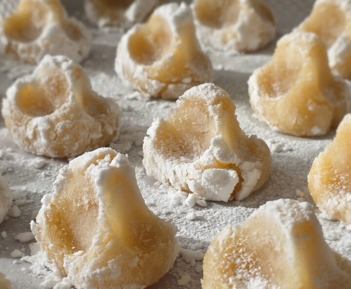 Una volta riposato, staccare dall’impasto dei pezzi da 25g ciascuno, formate delle palline, passatele nello zucchero a velo e siastematele su una teglia da forno rivestita da carta forno.