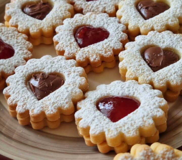 Una volta sfornati i biscotti, aggiungere il ripieno di nutella e sistamateli su un piatto da portata o alzatina per dolci.