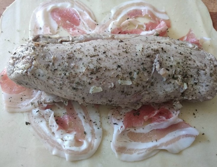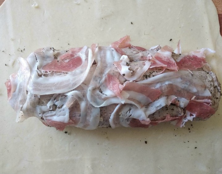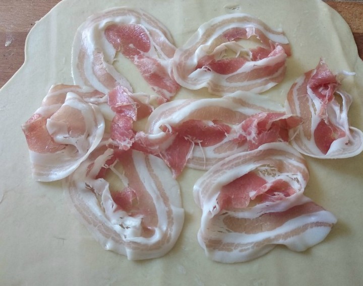 Distribuisci le fette di pancetta sulla sfoglia.