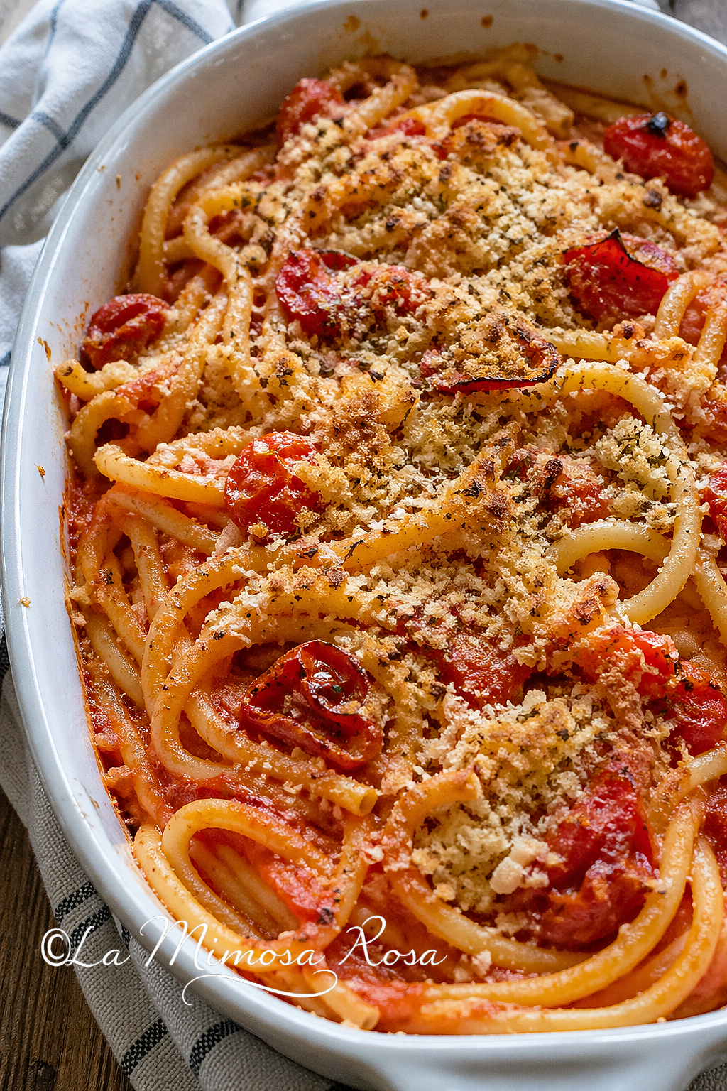 Versate i bucatini in una pirofila e aggiungete in superficie i pomodori tagliati a fette, spolverate con la restante parte degli ingredienti, aggiungete ancora un filo d’olio e passateli in forno ventilato, a 180° per 20 minuti, fino a quando si sarà formata in superficie una golosa crosticina! Servite i bucatini gratinati al forno appena fatti ma sono buonissimi soprattutto il giorno dopo!