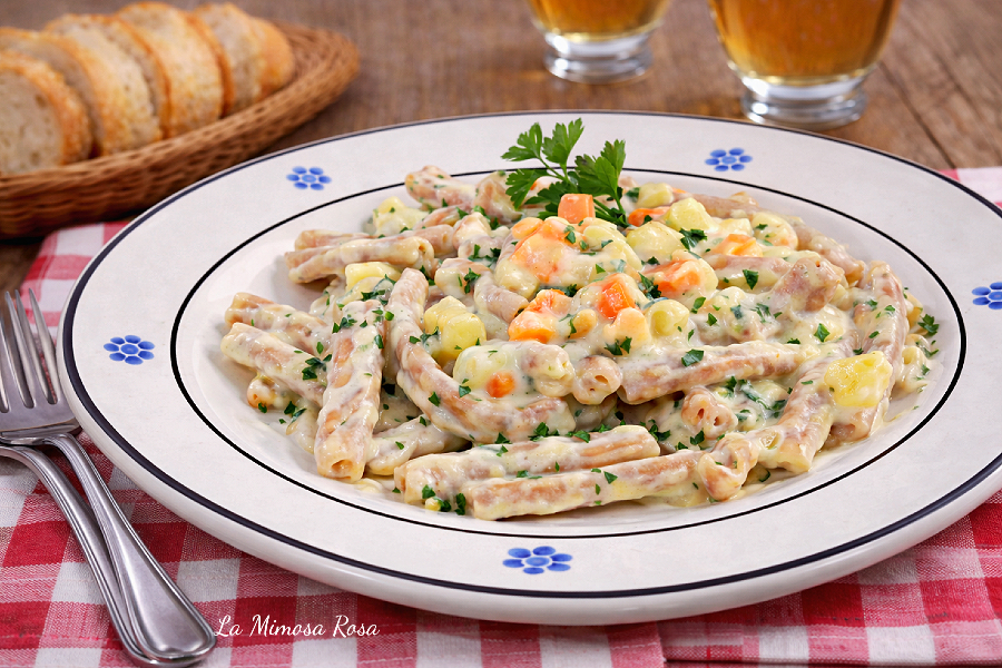Le caserecce di farro integrali con verdure cremose, sono un primo piatto golosissimo e sano, adatto a chi adora le paste cremose, come la sottoscritta! Ho trovato la ricetta in una vecchissima rivista di ricette, rispolverata giorni fa mentre facevo ordine tra i miei innumerevoli libri e le mie riviste di cucina. Un primo piatto vegetariano e leggero perchè ho utilizzato la panna di soia; spesso la sostituisco alla panna normale da cucina e devo ammettere che il gusto non cambia assolutamente! Una pasta deliziosa, dove il sapore delicatissimo delle verdure si unisce a quello corposo della panna, ideale da servire per un pranzo o una cena in famiglia o con amici! Pronti allora per preparare con me la pasta con verdure cremosa? Seguitemi in cucina e vediamo assieme come fare!
