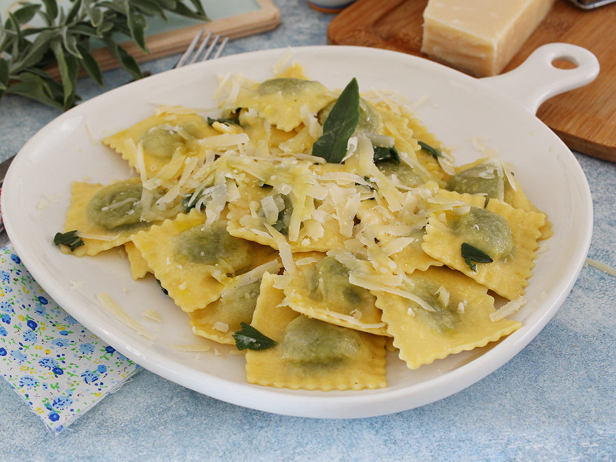 Quando si vuole andare sul sicuro, il condimento più elegante e tradizionale è il mix di burro fuso e foglie di salvia. È un matrimonio di sapori perfetto: il burro si lega alla pasta, mentre la salvia rilascia un profumo delicato ma deciso. Basta far sciogliere il burro a fuoco lento, aggiungere qualche foglia di salvia intera e lasciarla sfrigolare qualche secondo. Versate il tutto sui ravioli appena scolati e completare con Parmigiano Reggiano grattugiato. Un piatto semplice, ma di una bontà incredibile!