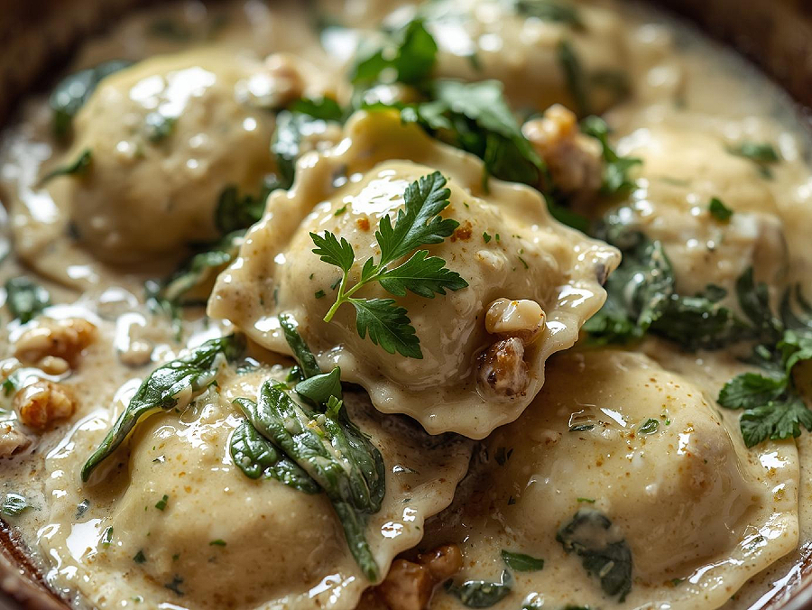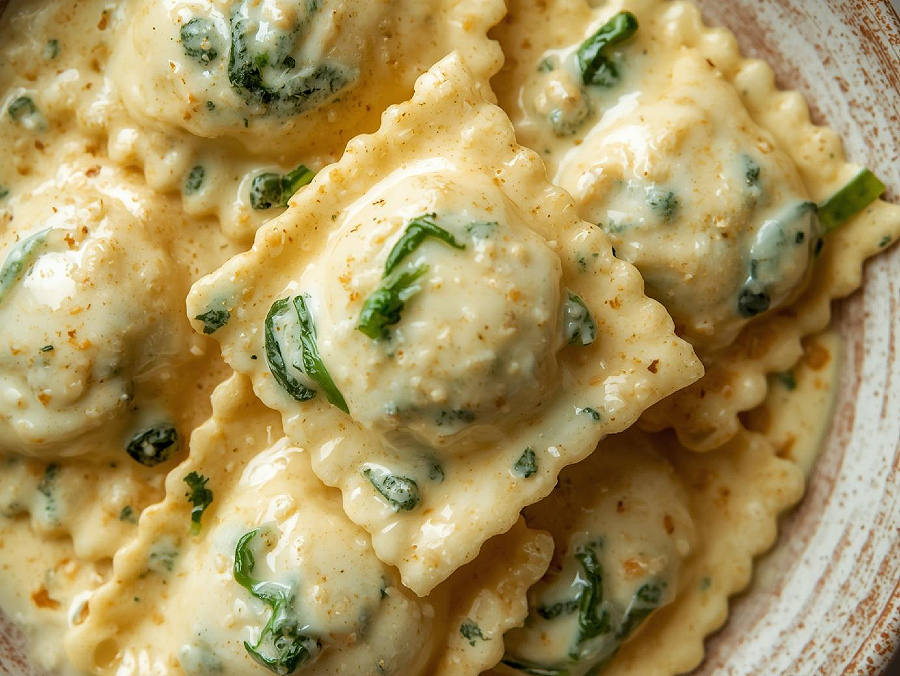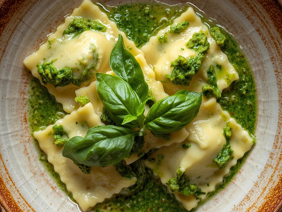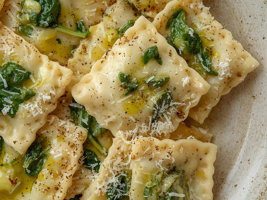 Quando i ravioli sono fatti bene, a volte basta il minimo. Conditeli semplicemente con olio extravergine d’oliva, pepe appena macinato, prezzemolo o basilico tritato e Grana Padano o Parmigiano. Questo condimento permette ai sapori del ripieno di emergere pienamente, regalando un piatto dalla bellezza essenziale.