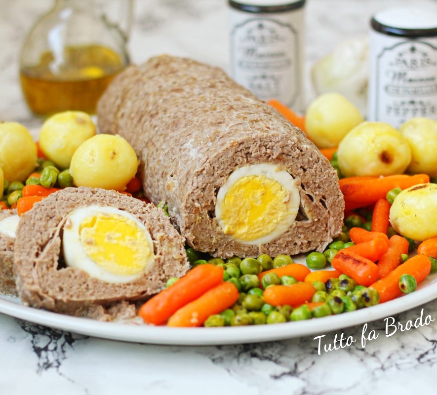 Un piatto ricco e sostanzioso, perfetto per un pranzo in famiglia o per una cena speciale. La base di carne macinata viene arricchita da un ripieno cremoso e saporito, che combina il gusto avvolgente del prosciutto cotto con le uova sode, creando un contrasto delizioso e una presentazione accattivante.