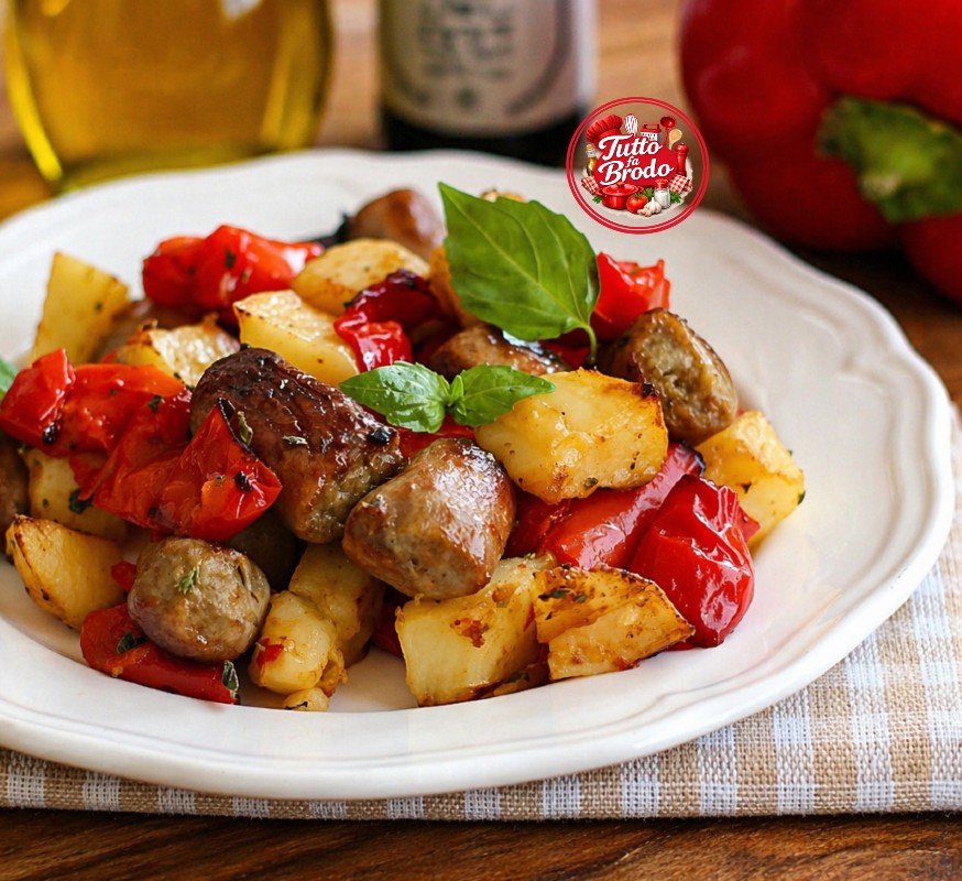 Un grande classico della cucina casalinga italiana che conquista tutti con i suoi profumi intensi e la semplicità degli ingredienti. In forno, patate e peperoni diventano morbidi e saporiti mentre la salsiccia rilascia tutto il suo aroma rendendo il piatto irresistibile.