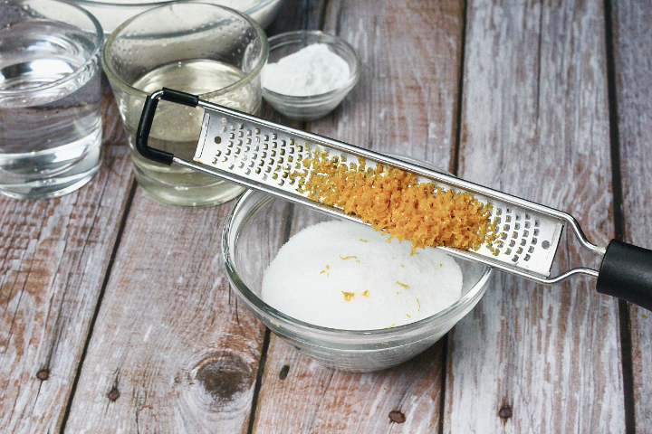 Grattugiate la buccia di arancia inserendola nella ciotola con lo zucchero, poi amalgamate con le mani.