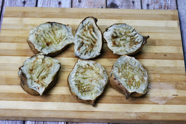 Patate dolci bianche farcite con provola affumicata, un piatto vegetariano che potete preparare in autunno e portare in tavola come antipasto rustico, oppure per contorno, o ancora come piatto unico a cena.