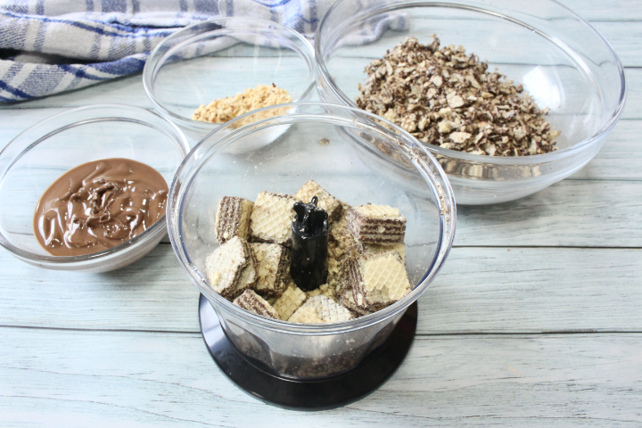 In alternativa potete inserire i wafer in un sacchetto per alimenti e tritarli finemente utilizzando un batticarne. Il risultato sarà lo stesso, l’unica cosa impiegherete qualche minuto in più.