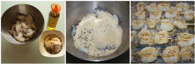 Panate le seppie nel composto ottenuto, se avanza mettetelo all’interno di ogni seppia pressando leggermente in modo che la panatura aderisca bene, preparate gli spiedini infilzando 3 – 4 seppie in ogni stecchino.