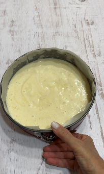 Rivesti uno stampo rotondo da 23 cm di diametro, con carta forno. Versa delicatamente il composto all’interno, livellandolo leggermente con la spatola.