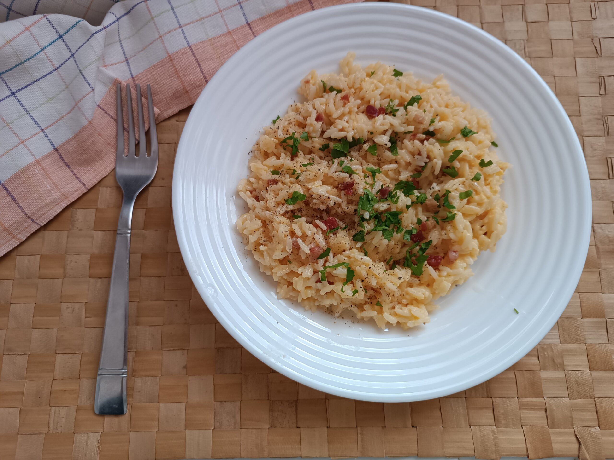 Il “Risotto alla Carbonara” è una fusione creativa che prende ispirazione da due pilastri della gastronomia italiana: il risotto, tipico del nord Italia, e l’iconica carbonara romana. Il risotto alla carbonara è un’esperienza gustativa ricca, perfetta per un’occasione speciale o quando si desidera coccolarsi con un piatto dal sapore indimenticabile. Questo piatto, pur non essendo un classico della tradizione, ne è liberamente ispirato, e quindi non essendo la ricetta codificata, mi sono permessa delle varianti, per adattare il piatto al gusto personale. Al posto del guanciale uso la pancetta affumicata, è una sostituzione comune.