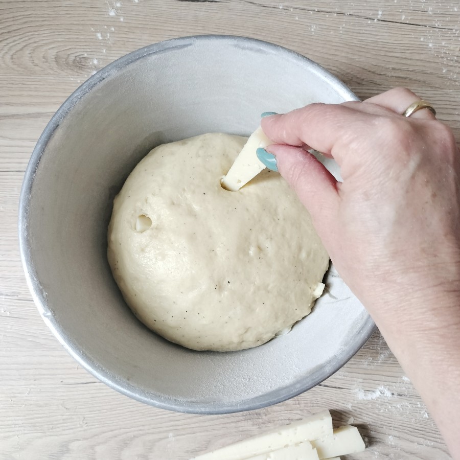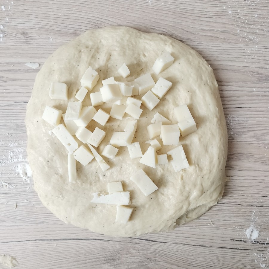 Passate le 2 ore versate l’impasto sul tavolo da lavoro leggermente infarinato, formate delle pieghe aiutandovi con un tarocco. Allargate leggermente l’impasto a formare un quadrato e inserite all’interno il formaggio a pezzetti.